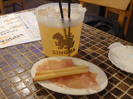 ■お通し(550円/人)、シンハーバケツ(1,099円)