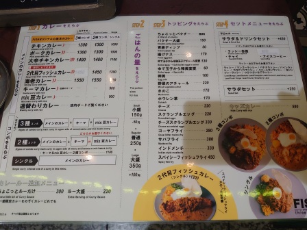 まずメインのカレーを選び、単品にするか2種or3種のコンボにするかを決めてから、ごはんの量を選び、好みでトッピングやセットを追加するシステムです。
