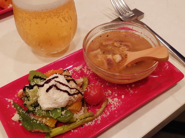 魚介を使ったアリオッタスープと、ゴゾチーズのスチームサラダを真っ赤なプレートで。