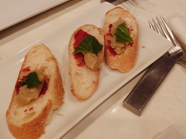フランスパンにトマトソースと乾燥ソラマメを使ったペースト、バジルの葉をトッピング。