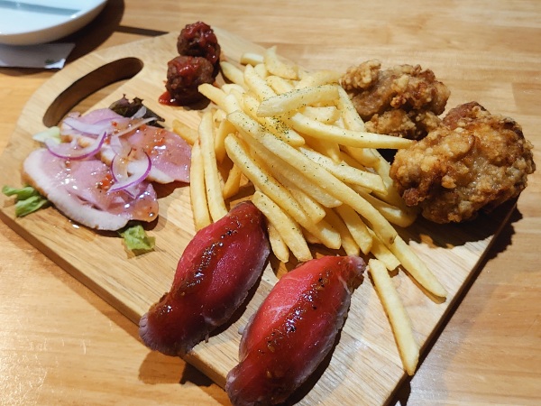キタアカリの揚げたてポテトフライを中央に、伊達鶏の若鶏唐揚げ、熟成だれのとろ旨肉寿司、和鴨の合鴨肉のカルパッチョ、ミートボール。