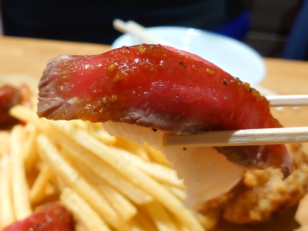 廉価版コースの地雷ワードにもなっている肉寿司ですが、なかなか酔い感じ。