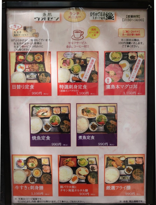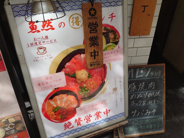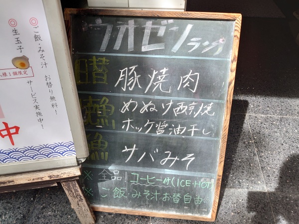 ランチメニューの立て看板にも、刺し身や焼き魚、煮魚の定食がラインナップされています。