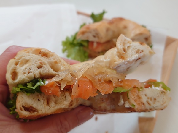 サーモンクリームチーズサンドには、オニオンのベーグルを使用。