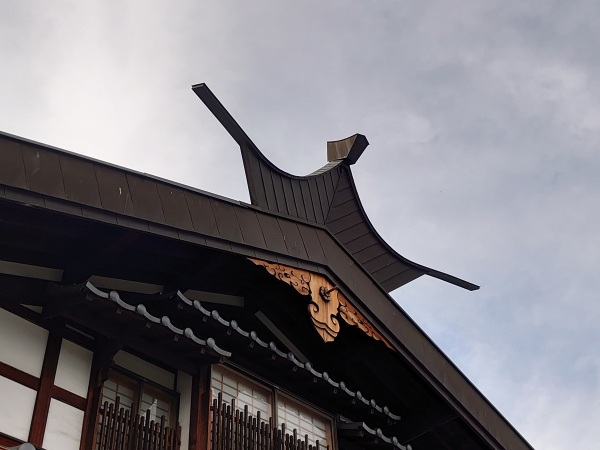 駐車場から見上げると、「雀おどり(雀おどし)」と呼ばれる屋根の飾りも立派です。