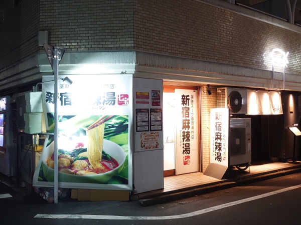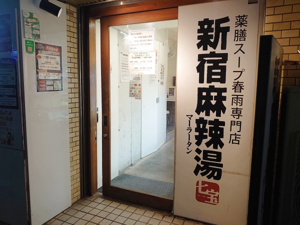 入り口右手の柱には「薬膳スープ春雨専門店 新宿麻辣湯」の看板。