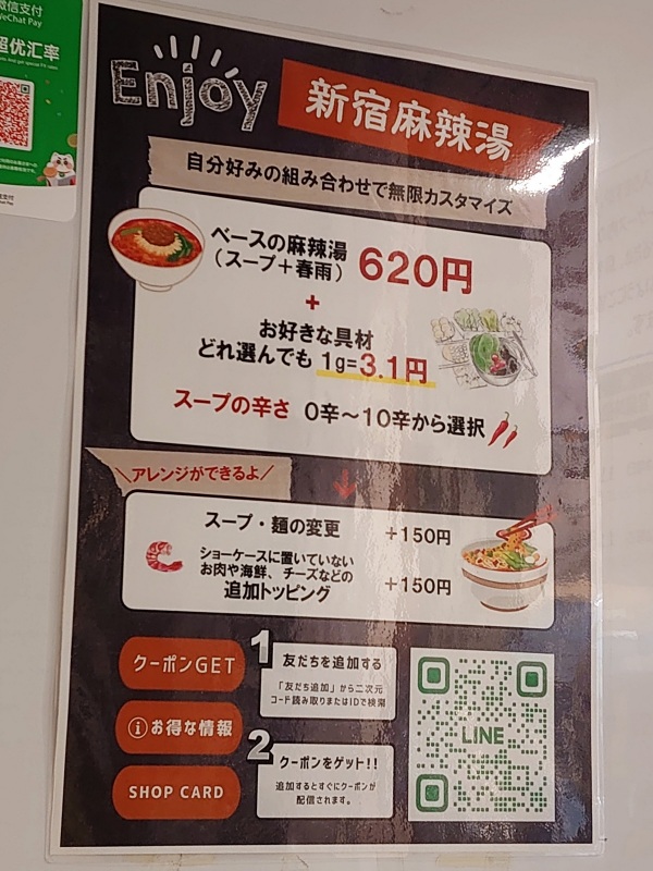 コチラのお店は、スープと春雨が入ったベース620円を最低料金とし、そこへ1gあたり3.1円で具材を追加していくシステム。