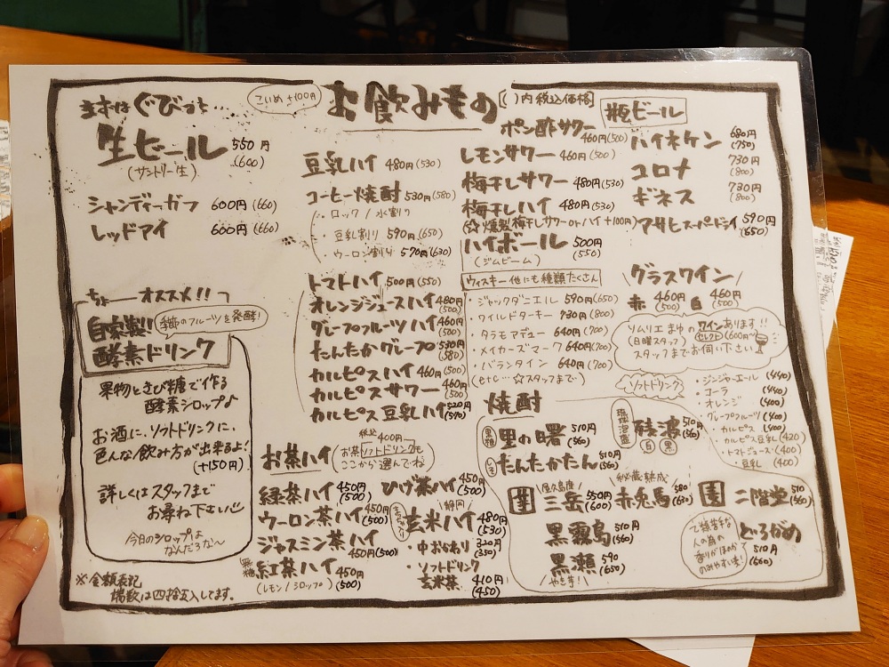 ワタクシは無糖紅茶ハイ(500円)、相棒は季節のフルーツを発酵させた自家製酵素シロップのサワーをいただきます。