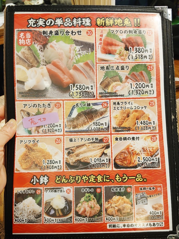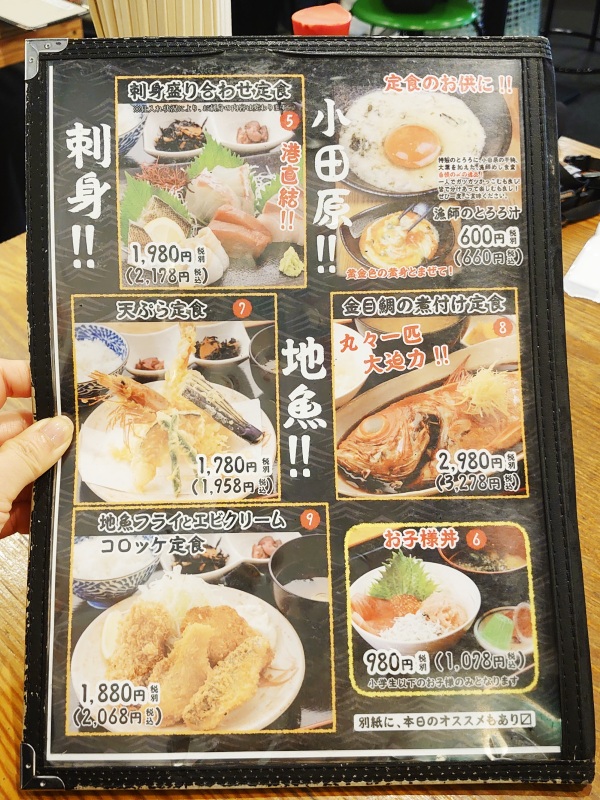 メニューを開くと「小田原!!」「刺身!!」「地魚!!」の文字が踊ります。