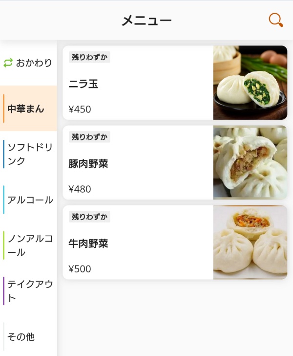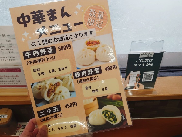 中華まんは牛肉野菜、豚肉野菜、ニラ玉の3種類。