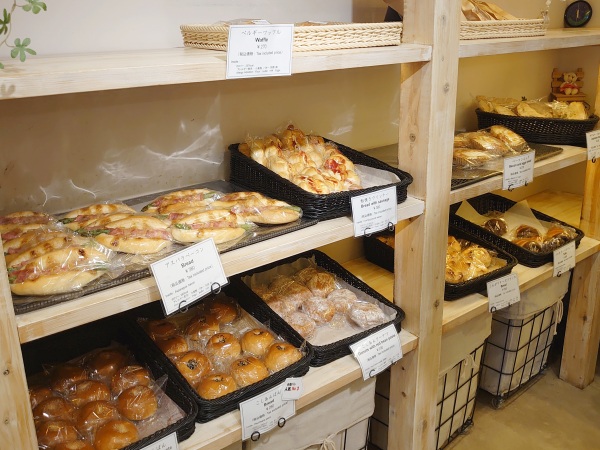 壁面に沿った棚に惣菜パンや菓子パンが並びます。