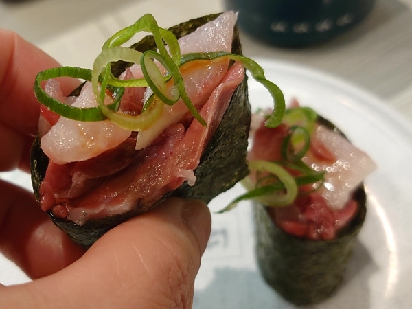 ハマチ(たぶん)の切り落としとネギをたっぷりのせた軍艦巻きに、醤油をちょろりと垂らして。