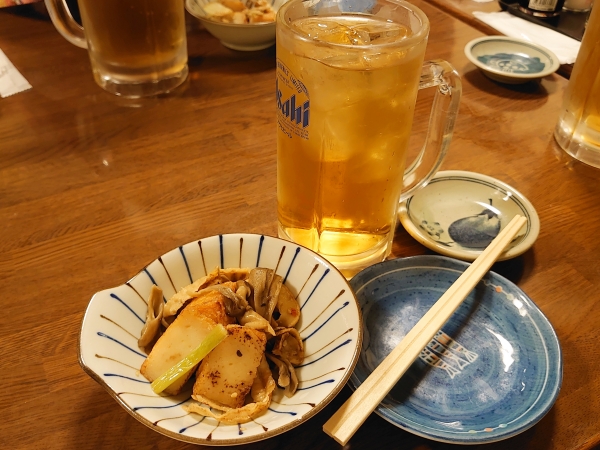 練り物やキノコ(エリンギ、シメジ)、ピーマンやネギなどの野菜をホタテの貝ひもとともに煮たお通しは、実に酔い味です。