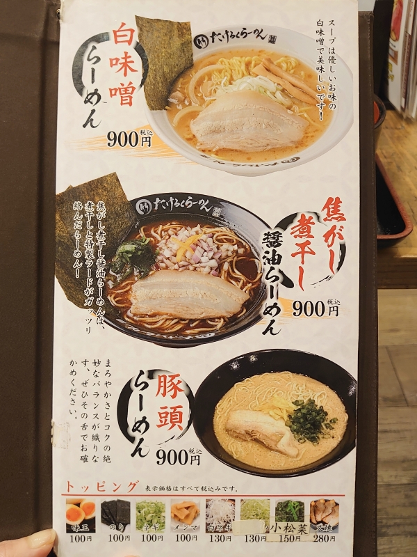 白味噌、焦がし煮干し醤油、豚頭のらーめんは各900円。