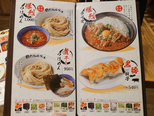 ページを開くと「爆烈つけめん」「爆烈ライス」なるお品が目を引きます。