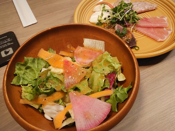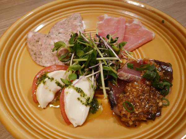 ボローニャソーセージに生ハム、カツオのたたき、カプレーゼ。