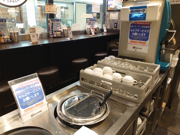 オーダーを済ませたら、セルフサービスの水とスープを取りに行きましょう。